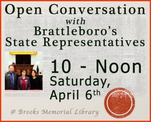 At 10 am on Saturday, April 6th, join your three Brattleboro State Representatives for a casual conversation about what’s been happening in Montpelier and beyond. Mollie S. Burke, Tristan Toleno, and Emily Kornheiser offer you the opportunity to speak with them directly about issues that concern you.
