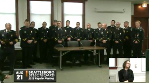 The Brattleboro Fire Department, and it looked as if just about all of them attended, formally received their First Responder of the Year Award at Tuesday’s meeting. Notice of the award came earlier in the year.