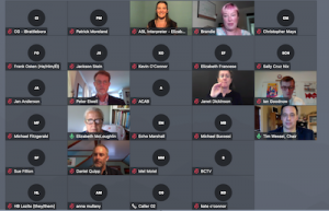 The virtual meeting begins as usual with little boxes of participants joining a screen. Board members say hello and test mics.