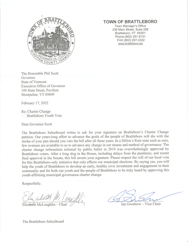 Attached is a letter that the Brattleboro Selectboard Chair Elizabeth McLoughlin sent today to Governor Phil Scott regarding the Youth Vote Charter Change.