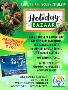 The annual All Souls Unitarian Universalist Holiday Bazaar will take place on Saturday, December 6, from 9 am to 3 pm, at the West Village Meeting House in West Brattleboro.