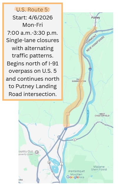 Beginning Monday, crews will be accessing the shoulders along U.S. Route 5 from the Interstate 91 overpass in Brattleboro north toward the intersection with Putney Landing Road in Putney. There is potential for single lane closures with flaggers to be in place from Wednesday to Friday from 7:00 a.m. to 3:30 p.m.