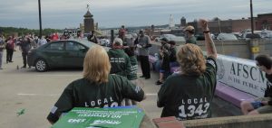 Following the speeches, the 100+ vehicle picket caravan, led by Union members on motorcycles from AFSCME 1343, 1674, & 490, headed downtown. Circling the City Hall block, Union members leaned on their horns to make sure the Mayor heard the sound of Labor unity in the Queen’s City.