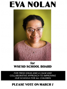 This Tuesday, please consider casting a vote for Eva Nolan as one of Dummerston’s 2 representatives on the WSESD school board, which serves Dummerston, Brattleboro, Putney, and Guilford.