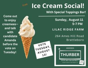 Windham District 7 Democratic candidate Amanda Ellis-Thurber will host an old fashioned ice cream social on Sunday, August 11th between 5 and 7 PM at Lilac Ridge Farm, 264 Ames Hill Road.