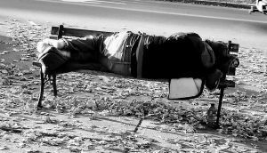 Photo: Person living unhoused outdoors resting on a bench in Montpelier, the capital city of Vermont (photo shared with the direct consent of the person pictured; image credit: Morgan W. Brown).