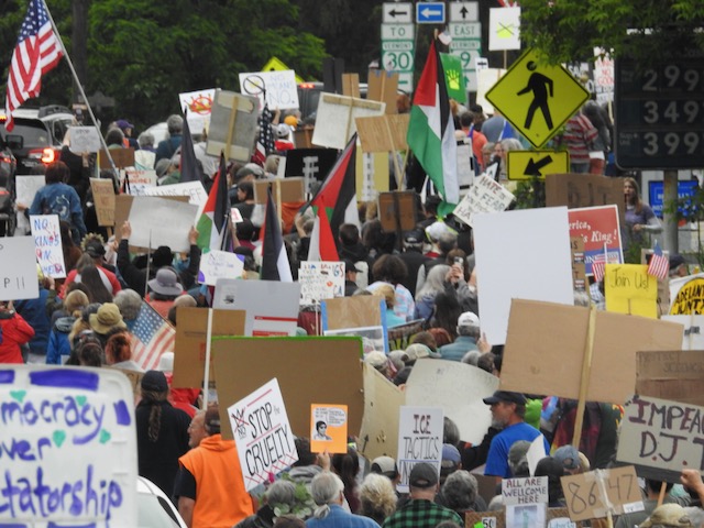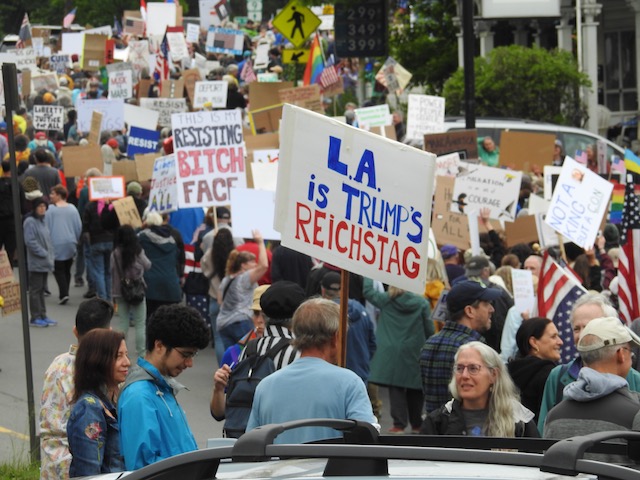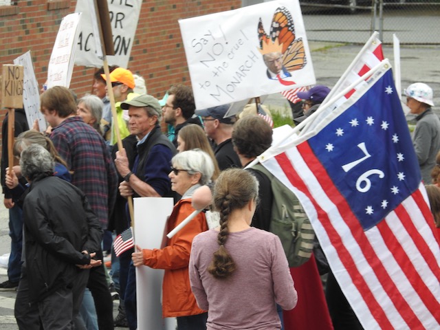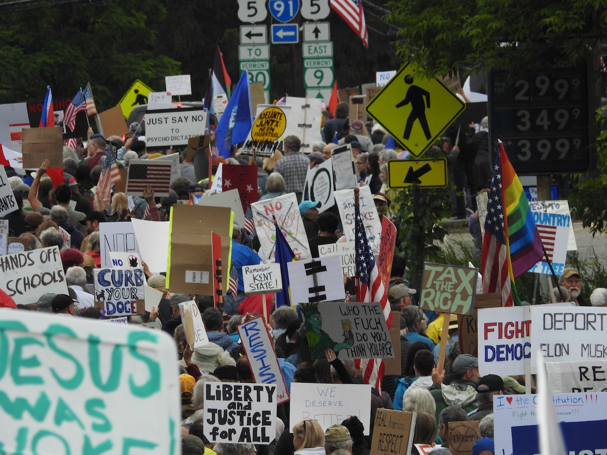 More than 2500 turned out to protest today in Brattleboro. The number was according to a speaker at the stage at the common, and was probably an undercount, as people were still arriving. Indeed, Brattleboro was filled with people today. Cars filled side streets and church parking lots. Church bells were ringing out. There were people marching, chanting, singing, playing music and holding their signs and flags up as they marched.