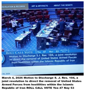 March 4, 2026 Motion to Discharge S. J. Res. 104, a joint resolution to direct the removal of United States Armed Forces from hostilities within the Islamic Republic of Iran. ROLL CALL VOTE: Yea 47, Nay 53