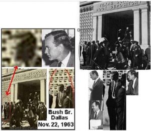 The pictures depict the Texas Book Depository, and purport to show GHW Bush standing in front.