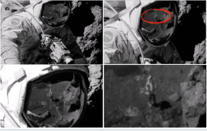A NASA clip from Apollo 17 mission (1972) shows astronaut Eugene Cernan examining rocks in the Taurus-Littrow lunar valley. The reflection in his visor appears to show the person taking the picture. Cernan is standing next to a large rock outcropping with a small instrument sitting on the dusty lunar surface in front of him.