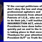 I don’t use Truth Social, my cellphone number was permanently banned. (Applause!) But this is going around, apparently President Trump is threatening to use the Insurrection Act.