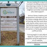 Serious illness, hospice, and bereavement volunteers at Center for Solace undergo about 25 hours of training, and then work directly with clients, either one on one or facilitating support groups. You’ll learn to be a supportive presence to a person or family going through a difficult time.
