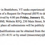 Brooks Memorial Library in Brattleboro, VT seeks experienced consultant to guide staff and trustees in preparation of a Request for Proposal (RFP) to develop a new website. Submissions must be received by 4:00 pm Friday, January 11, 2019 at Brattleboro Town Manager’s Office, Attn: BML Website RFQ, 230 Main Street, Suite 208, Brattleboro, VT 05301, at which time and place all submissions will be publicly opened and read aloud.